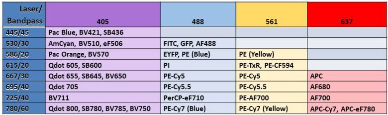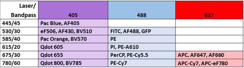 FACS core facility currently has two instruments: NovoCyte 3000 and NovoCyte Quanteon. Both instruments are equipped with autosampler for tubes and plates. The configurations of the instruments are given below.