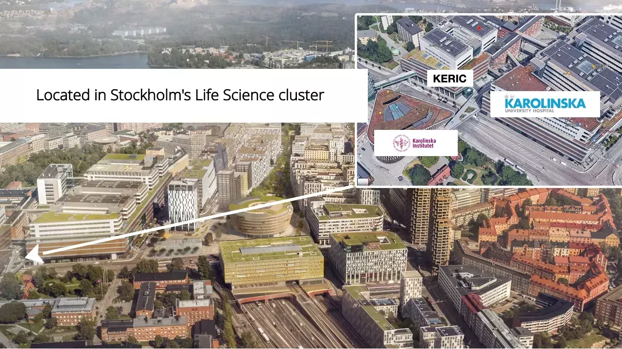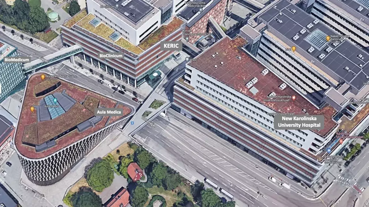 KERIC is located right in the middle of Stockholm’s Life Science Center. Right between the New Karolinska University Hospital main building and Aula Medica, were the Nobel prize in Medicine usually gives the Nobel Lecture.