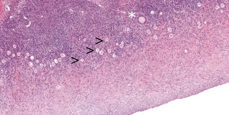 Dina äggstockar är ungefär lika stora som ett vaktelägg. De omogna äggcellerna finns nära ytan, ca 1 mm djupt, inom så kallade primordialfolliklar (se Bild 1). Primordialfolliklarna bildas redan under fosterutvecklingen, och vid födseln finns några miljoner. En kvinna i 20-årsåldern har i genomsnitt 100 000 primordialfolliklar kvar, och en 40-årig kvinna ungefär tio gånger färre.